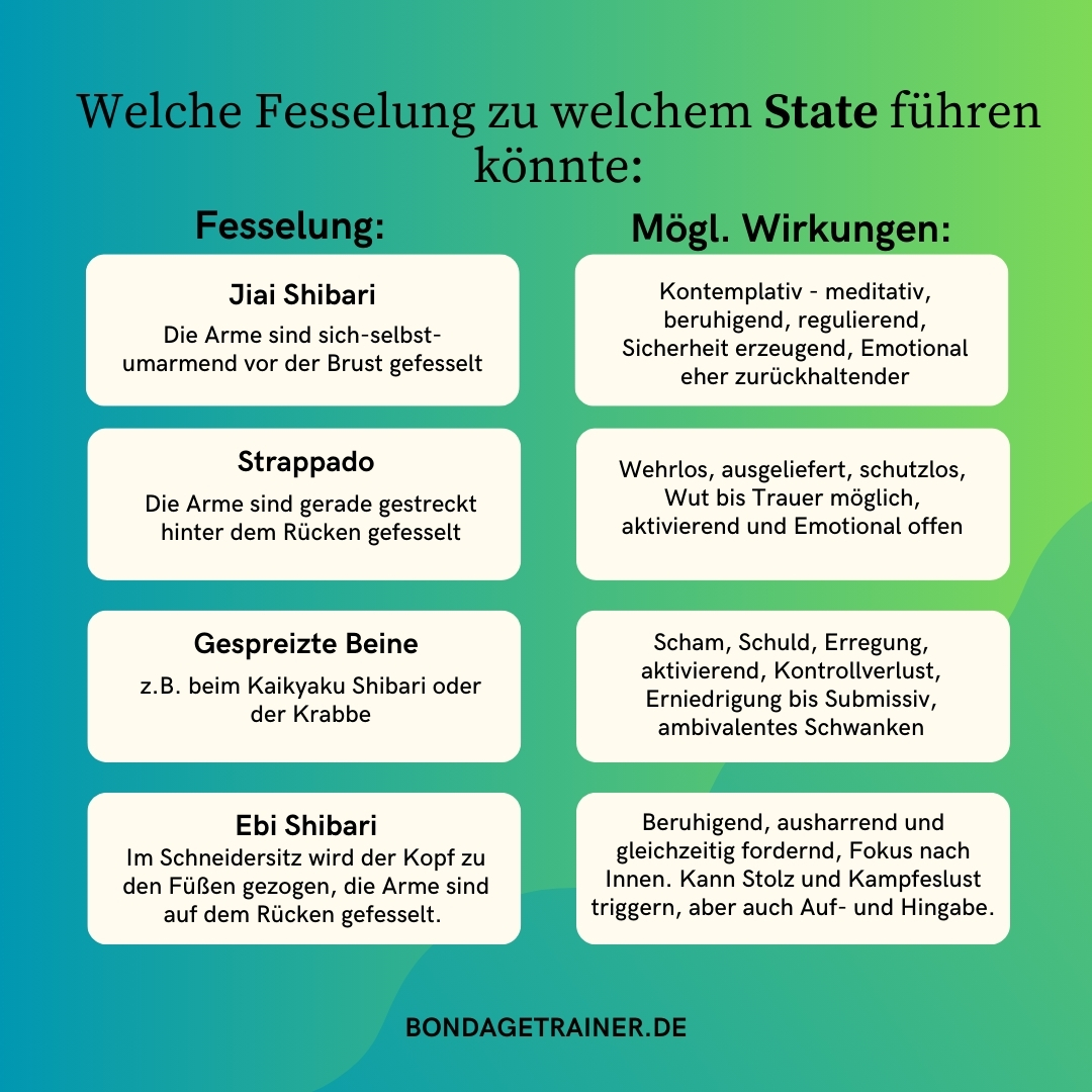 In dieser Übersicht kannst du ablesen, welche Fesselung welchen State fördern oder auslösen kann: