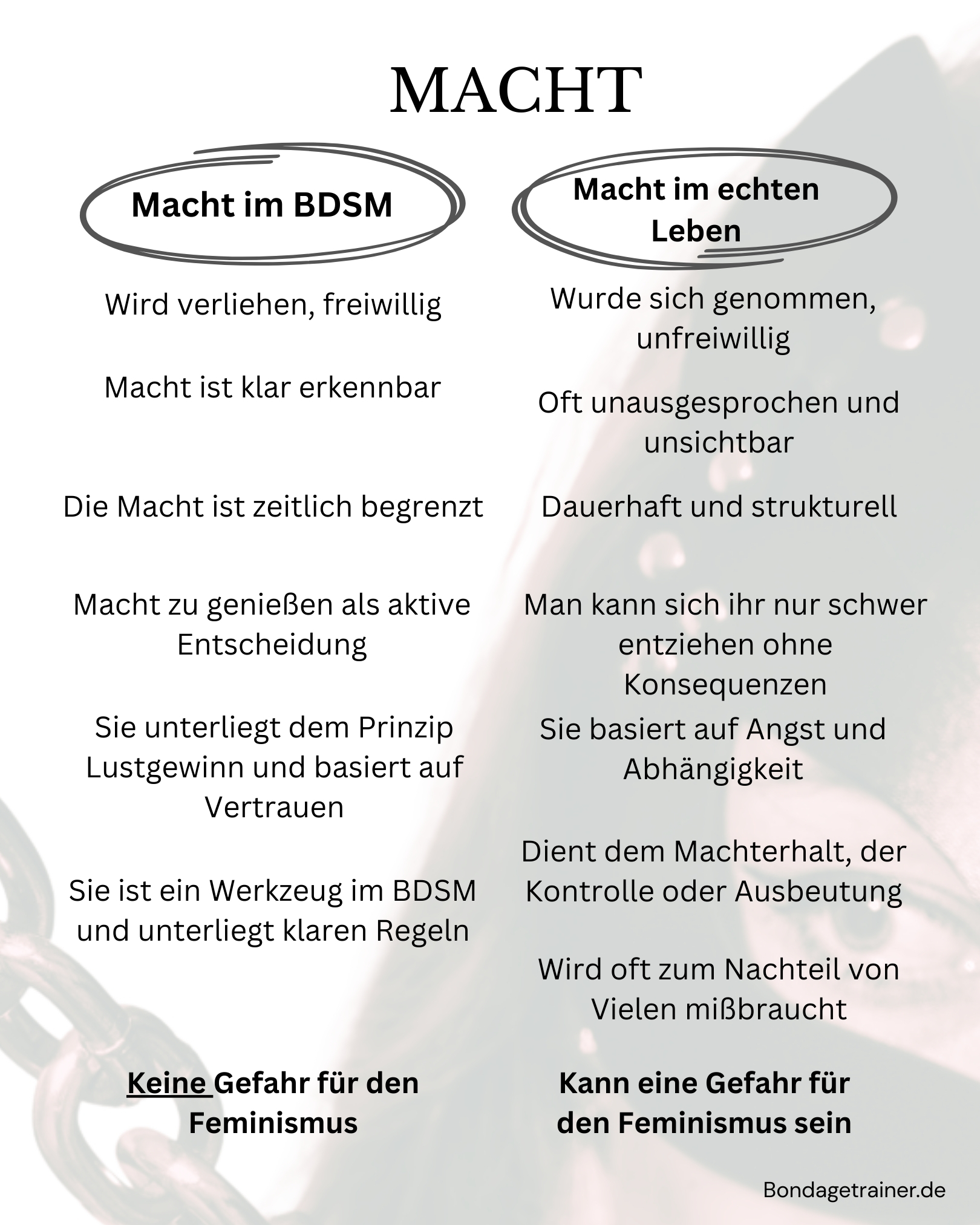 Im BDSM wird Macht bewusst verliehen, klar begrenzt und dem übergeordneten Ziel von Lust und Freude unterstellt. Diese spielerische Macht unterscheidet sich fundamental von struktureller Macht, die Menschen oft schadet, wenn sie missbraucht wird. Wer das vermischt, missversteht den Kern von BDSM - und auch den Kern feministischer Kritik.