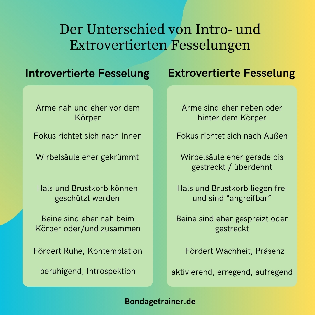 Also solche, bei denen die Aufmerksamkeit des Models eher nach Innen (Introvertierte Fesselungen) oder eher in den Raum hinein, nach Außen (Extrovertierte Fesselungen) gelenkt wird. Je nachdem was man erreichen möchte, wirkt die Fesselung dann eher beruhigend und kontemplativ oder eher aufregend und aktivierend. Das kann man z.B. mit einem Mix aus Wirbelsäulenbeugung, Blickrichtung und Armposition erreichen: