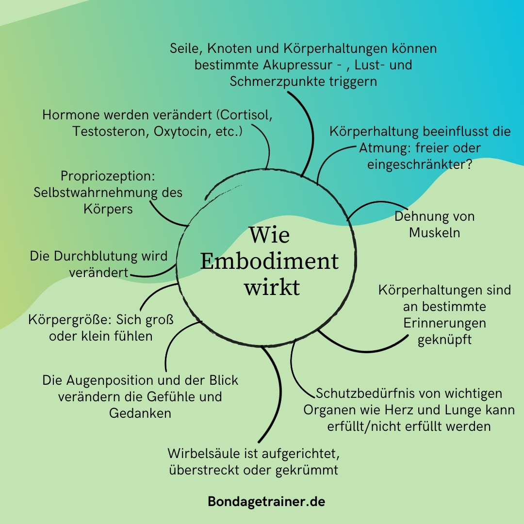 - Die Emotionale Reaktion auf Fesselungen hat auch super viel mit Faktoren, wie Enge der Fesselung, Erfahrung des Models, Anzahl der Seillagen, Setting und Herangehensweise, die Dauer der Fesselung, die Intention, welche Bilder im Kopf dazu ablaufen, etc. zu tun. Embodiment schaut sich nur einen kleinen Teil des Gesamtkonstruktes an - nämlich die Körperhaltung.