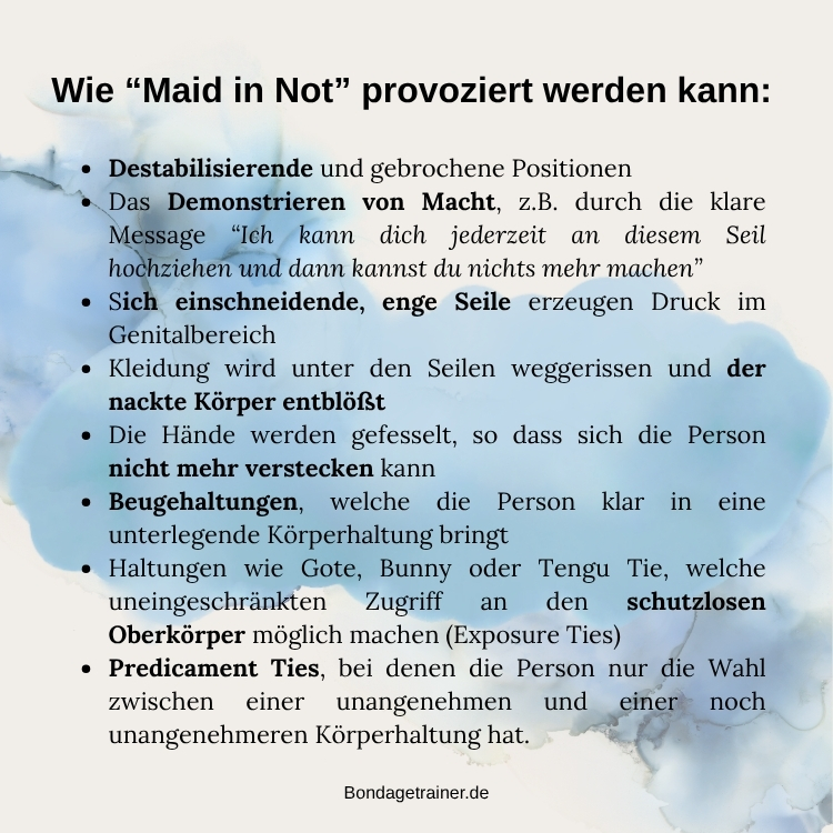 Die “Maid in Not” ist eine junge, schöne Frau, die in eine Notsituation gerät und darin große Hilflosigkeit und Ohnmacht erfährt. Häufig wird sie gefesselt und von Umständen bedroht, die eine Vielzahl an Emotionen in ihr auslösen. Sie ist nicht nur körperlich ausgeliefert - auch emotional ist sie gefangen und Opfer sich abwechselnder Zustände von Scham, Stolz, Erregung, Angst, Schüchternheit oder Hingabe. Ihre Schönheit und Reinheit vermischen sich mit ihrem Leid und werden zur Projektionsfläche für erotische Fantasien.