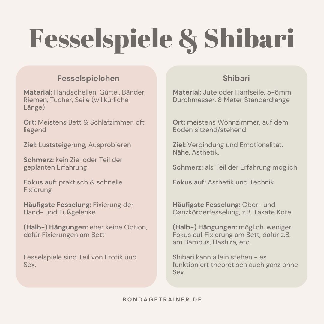 Während es im Shibari und Kinbaku oft auch um Hingabe und das Provozieren, bzw. Zulassen von Emotionen gehen kann und das Seil mit all den Fesselungen ein recht zentrales Element ist, so sind bei einfachen Fesselspielen die Seile, bzw. andere Utensilien, eher Mittel zum Zweck. Ziel ist einfach die Luststeigerung.