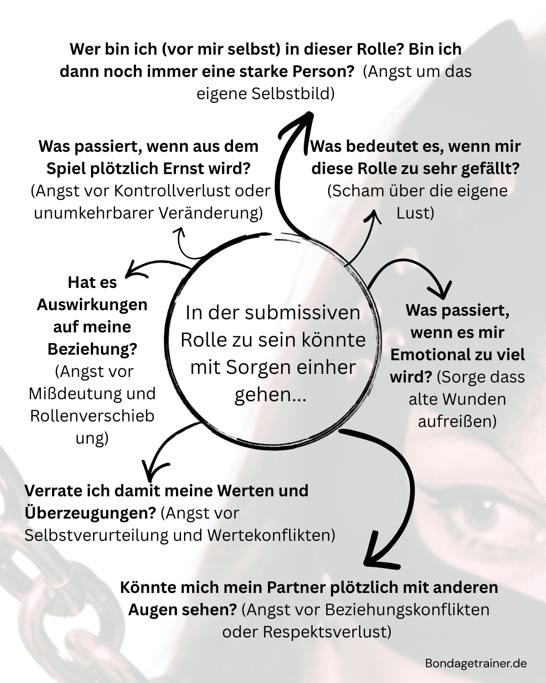 Manche Menschen - insbesondere Frauen - tragen die Sorge in sich, dass ihr Gefallen an der submissiven Rolle als vermeintlicher Beweis für “ihre wahre Natur” verstanden werden könnte. Sie haben Angst, dass ihr Körper sie verrät und das Gegenüber sie missversteht - als wenn sie der Lüge überführt werden würden. Aber Erregung und Geilheit sind keine “Geständnisse” - das ist kompletter Unfug.