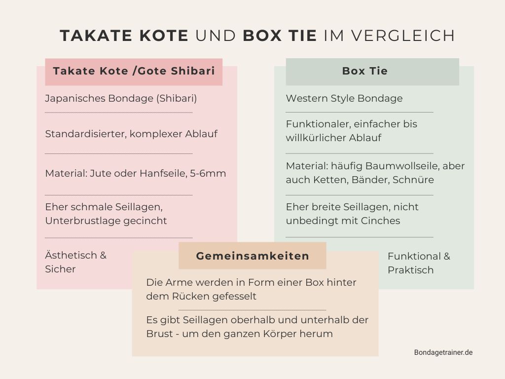 Der Box Tie / der Takate Kote gehören zu den am häufigsten gefesselten Formen im Bondage und BDSM allgemein. Häufig haben Mensch sich zuerst an dem ein oder anderen Box Tie versucht, bevor sie dann schließlich zum Japanischen Bondage kommen.